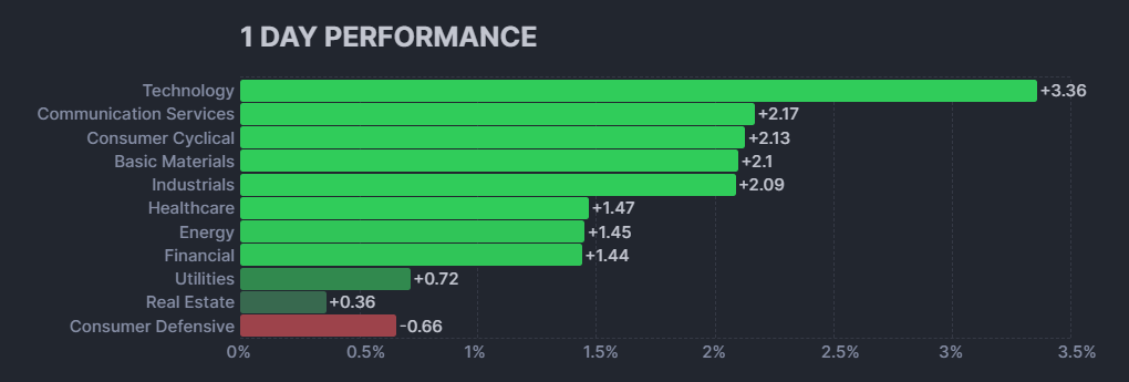 昨日のセクター別パフォーマンスは10セクターが上昇、1セクターのみが下落した1日となりました。