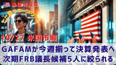 市場分析 【GAFAMが今週揃って決算発表へ】 次期FRB議長候補5人に絞られる 昨日の米国市場は大きく上昇しました。米中貿易協議に前向きな姿勢が見られたことで、市場は楽観に包まれました。また、今週揃って発表されるGAFAMの決算への期待も高まっているようです。それでは昨日の米国市場を振り返っていきましょう。リッヒ記事後... 2025.10.28 市場分析