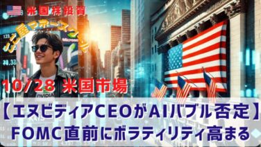 市場分析 【エヌビディアCEOがAIバブル否定】FOMC直前にボラティリティ高まる 昨日の米国市場は上昇しました。訪日中のトランプ大統領がエヌビディアのジェンスン・フアンCEOと会談すると発表したことや、同CEOが多くのAI関連企業と提携を発表したことで株価を急騰させています。それでは昨日の米国市場を振り返っていきましょう... 2025.10.29 市場分析