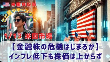 市場分析 【金融株の危機はじまるか】インフレ低下も株価は上がらず 昨日の米国市場はわずかに下落しました。12月のCPIが発表されコア指数が予想を下回り、インフレの鈍化が確実なものになってきました。一方で、決算発表のあったJPモルガン・チェースの収入が予想に反して減少していることがわかり、金融株が連れ安とな... 2026.01.14 市場分析