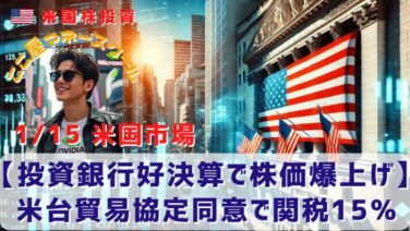 市場分析 【投資銀行好決算で株価爆上げ】米台貿易協定同意で関税15% 昨日の米国市場は上昇しました。台湾セミコンダクターの決算発表がAI関連銘柄に追い風になったようです。また、心配されていた大手銀行決算ですが、ゴールドマンサックスとモルガンスタンレーが好決算を発表してくれました。それでは昨日の米国市場を振り返... 2026.01.16 市場分析