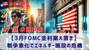 市場分析 【3月FOMC金利据え置き】戦争激化でエネルギー施設の危機 昨日の米国市場は大きく下落しました。FOMCでは予想通りの金利据え置きが発表されましたが、戦争による不確実性が高まる中で利下げは実施されないとの見方が高まりました。一方で、インフレの加速が示され、スラグフレーション懸念から株式が売られていま... 2026.03.19 市場分析