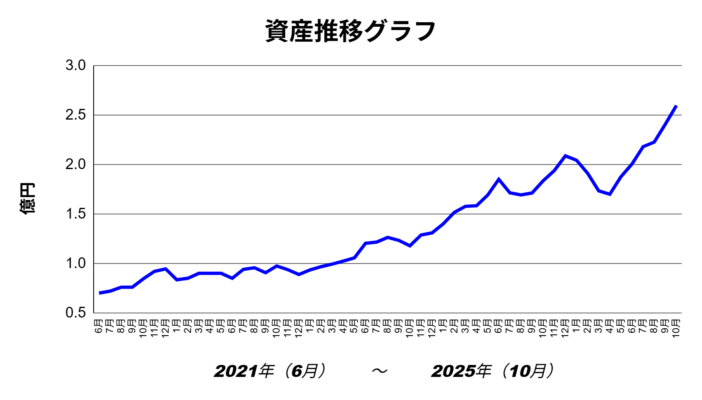 現在の総資産は2億5,960万円で、前月比は+1,890万円(+7.85%)ほど増加しています。年初来では5,090万円増の+24.39%。(2025年スタート2億870万円)