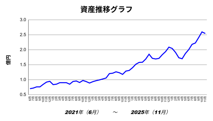 現在の総資産は2億5,430万円で、前月比は▲530万円(▲2.04%)ほど減少しています。年初来では5,090万円増の+21.85%。(2025年スタート2億870万円)