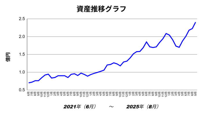 現在の総資産は2億4,070万円で、前月比は+1,810万円(+8.13%)ほど増加しています。年初来では3,200万円増の+15.33%。(2025年スタート2億870万円)