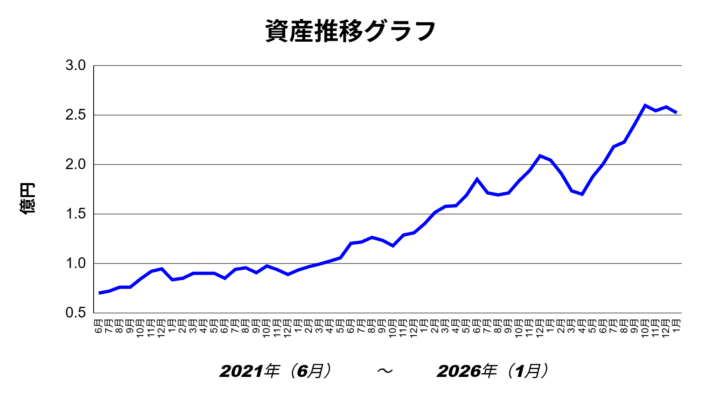 現在の総資産は2億5,220万円で、前月比は▲590万円(▲2.29%)ほど減少しています。(2026年スタート2億5,810万円)