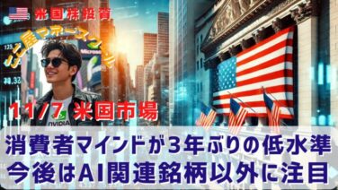 市場分析 【消費者マインドが3年ぶりの低水準】今後はAI関連銘柄以外に注目 昨日の米国市場は大きく下落しました。昨日も下げるのかと思いましたが、政府閉鎖が終了するかも知れないといった期待から引けにかけて買い戻されています。一方で、経済指標の発表では関税圧力から見通しが暗くなり、物価上昇圧力は高まっているとのこと。そ... 2025.11.08 市場分析