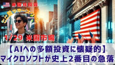 市場分析 【AIへの多額投資に懐疑的】マイクロソフトが史上2番目の急落 昨日の米国市場は前日に続けて下落しました。メガテックが決算発表によって下落し、市場に連鎖したようです。やはり過度なAI投資は市場を不安にさせるようです。それでは昨日の米国市場を振り返っていきましょう。リッヒ記事後半では重要な経済ニュースや今... 2026.01.30 市場分析