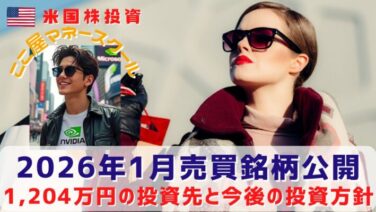 売買記録 1,204万円の投資先【2026年1月の売買銘柄を公開】今後の投資方針の発表 【1,204万円の投資先は〇〇!】2026年1月に売買した銘柄を公開!投資信託・米国ETF・米国株(個別株)・暗号資産それぞれの購入銘柄は何?トランプ政権と利下げに注目が集まる米国市場の投資戦略を解説! 2026.02.08 売買記録