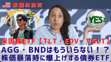 米国ETF AGG・BNDはもういらない!?【TLT・EDV・VGLT】株価暴落時に爆上げする債券ETF 株価暴落時に爆上げする債券ETFについて解説!TLT・EDV・VGLTは株価とキレイな逆相関の債券ETF!ポートフォリオに債券を組み込むことは、多くの投資家に推奨されていますが、あなたのポートフォリオに『AGG』や『BND』は必要ですか? 2021.02.12 米国ETF