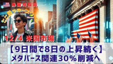 市場分析 【9日間で8日の上昇続く】メタバース関連30%削減へ 昨日の米国市場はわずかに上昇しました。S&P500は小幅な上昇でしたが、直近9日間で8日が上昇という好調な相場が続きます。翌週にFOMCを控えた中で、FRBも市場関係者も労働市場に関するニュースに敏感になっているようです。それでは昨日の米国... 2025.12.05 市場分析