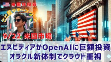 市場分析 【エヌビディアがOpenAIに巨額投資】オラクル新体制でクラウド重視 昨日の米国市場は上昇しました。3指数ともに連日の高値更新となり、米国市場は楽観一色に染まっています。エヌビディアがOpenAIに巨額の投資するニュースによって、AI市場にも一段と追い風が吹いています。それでは昨日の米国市場を振り返っていきま... 2025.09.23 市場分析