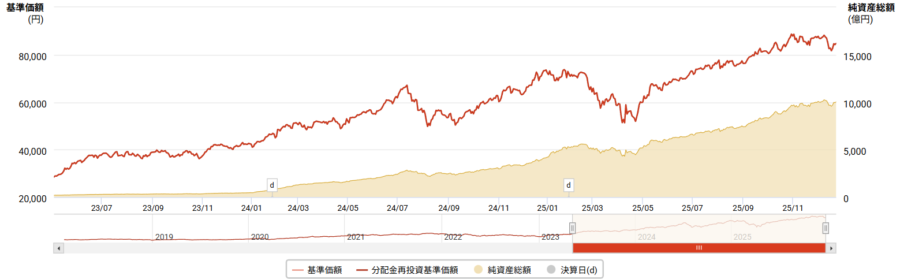 2018年1月31日に基準価格10,000円ではじまった同ファンドは、2025年12月までのおよそ7年で基準価格が84,770円(+747%)にまで上昇しています。