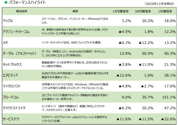 それでは2025年11月末時点の組入れ銘柄のリターンを見ていきます。