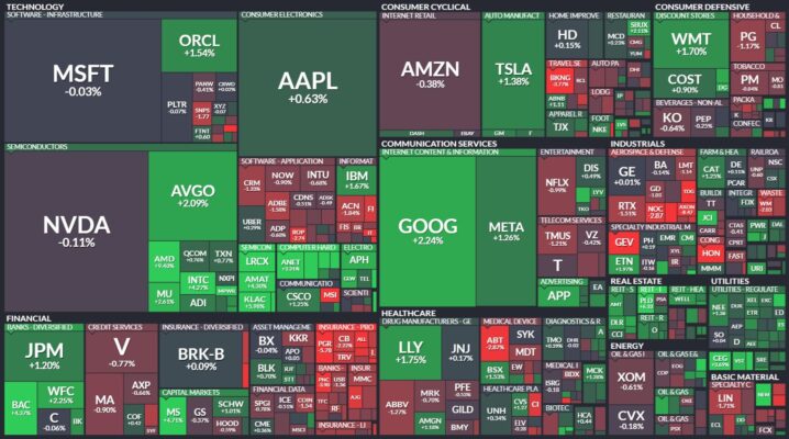 昨日のS&P500のヒートマップを眺めると、上昇と下落が半々といったように見えます。