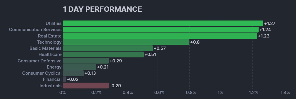 公益事業や通信、不動産といったセクターが1%を超える大きな上昇。