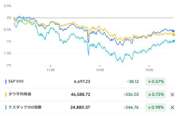 マグニフィセント7は3銘柄が上昇、4銘柄が下落。MSFTは+0.56%とわずかに上げていますが、AMZNが▲1.84%、AAPLが▲1.64%と大きく下げています。