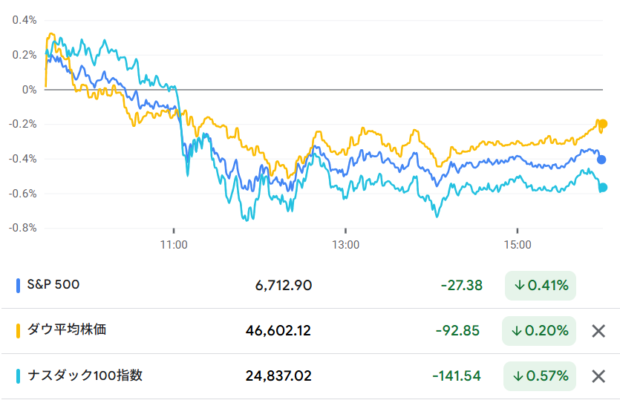 マグニフィセント7はAMZNが+0.40%上昇した以外6銘柄が下落。特にがTSLAが▲4.45%、GOOGが▲1.74%と大きく下落しています。