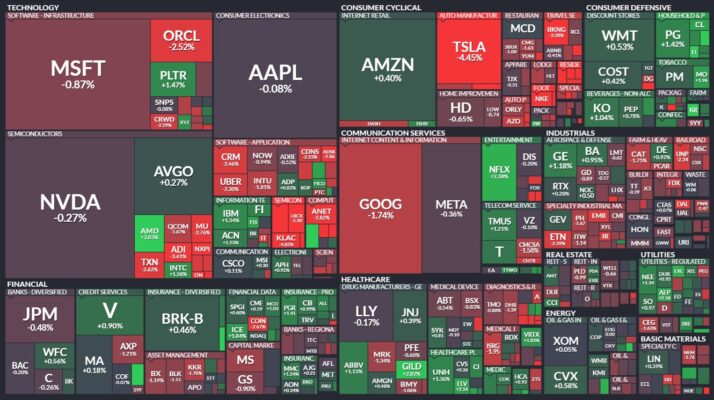 昨日のS&P500のヒートマップを眺めると、上げた銘柄と下げた銘柄が半々といったように見えます。