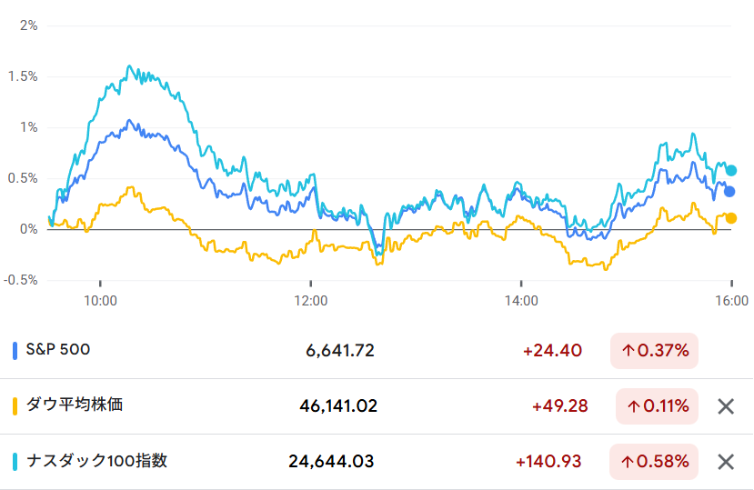マグニフィセント7は5銘柄が上昇、2銘柄が下落。NVDAが+2.85%、GOOGが+2.82%と大きく上げていますが、MSFTが▲1.35%、METAが▲1.23%と大きく下げています。