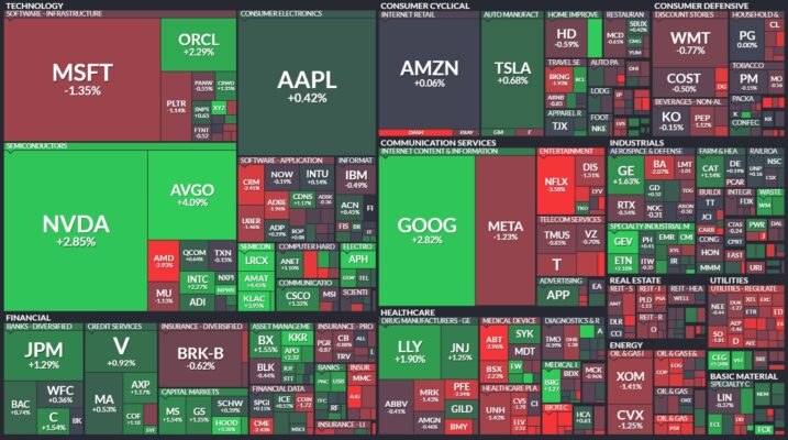 昨日のS&P500のヒートマップを眺めると、上昇と下落の銘柄が半々といったように見えます。