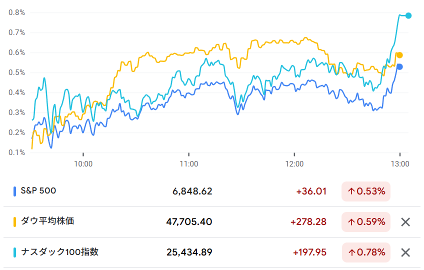 プレマーケットから買われていた相場は、マーケットがオープンしてもダウを中心に上昇していきました。