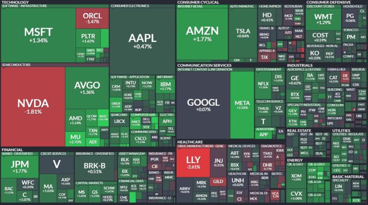 昨日のS&P500のヒートマップを眺めると、ほとんどの銘柄が上昇したことがわかります。