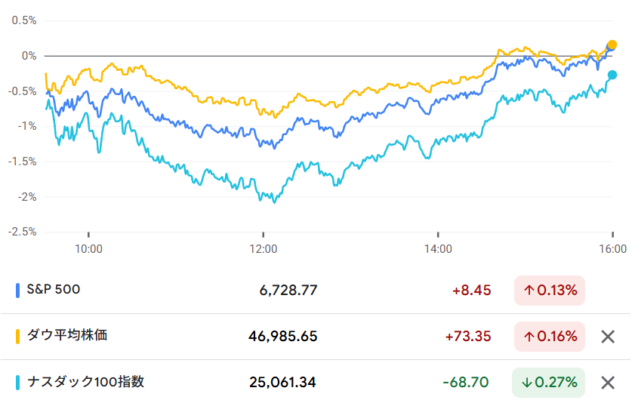 マグニフィセント7は3銘柄が上昇、4銘柄が下落。METAやAMZNなどわずかに上げていますが、TSLAが▲3.68%と大幅続落、GOOGは▲1.98%と大きく下げています。