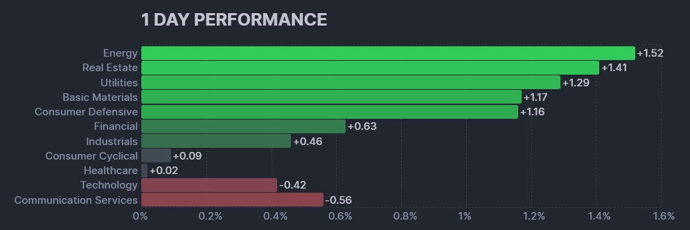 エネルギーと不動産、公益事業など5セクターは1%を超える大きな上昇。