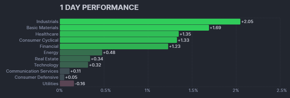 昨日のセクター別パフォーマンスは10セクターが上昇、1セクターのみが下落した1日となりました。
