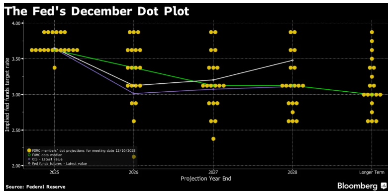 12月のFOMCが開催され予想通り0.25%の利下げで、政策金利は3.5-3.75%のレンジとなりました。