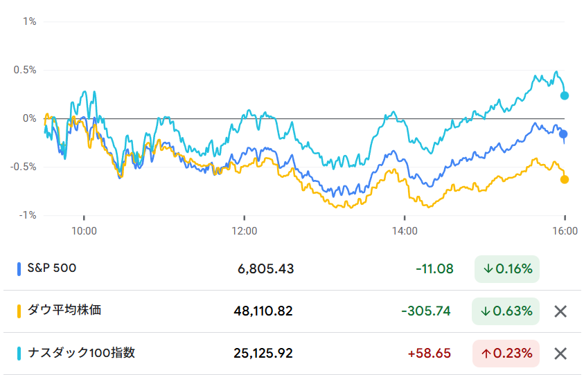 その後も売り優勢の相場が続き、引けにかけて上昇していくもS&P500とダウは上がりきることはありませんでした。