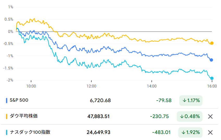 マグニフィセント7はすべてが下落。TSLAが▲4.62%、NVDAが▲3.81%、GOOGLが▲3.21%と急落しています。