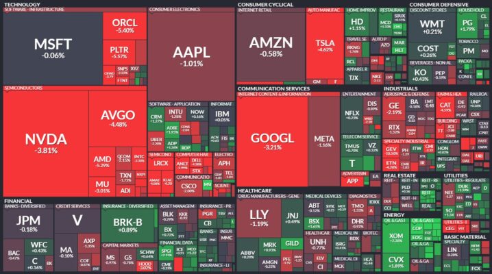 昨日のS&P500のヒートマップを眺めると、下落した銘柄の方が多かったことが分かります。
