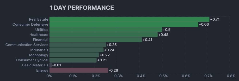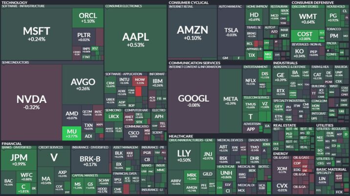 昨日のS&P500のヒートマップを眺めると、ほとんどの銘柄がわずかに上昇したことが分かります。