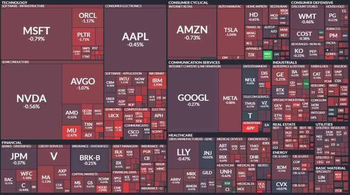 昨日のS&P500のヒートマップを眺めると、ほぼすべての銘柄が下げていることが分かります。
