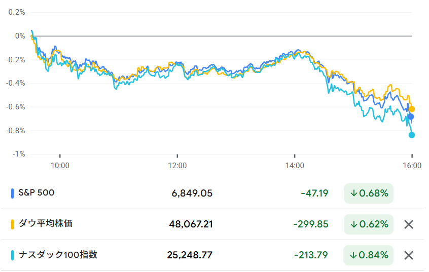 マグニフィセント7は7銘柄すべてが下落。TSLAが▲1.04%、METAは▲0.88%と下げています。