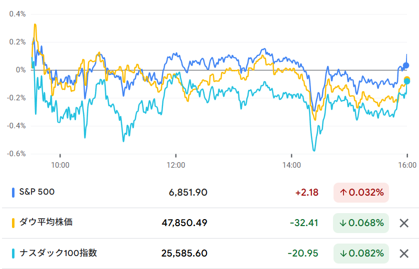 マグニフィセント7は4銘柄が上昇、3銘柄が下落。METAが+3.43%、NVDAが+2.11%、TSLAが+1.74%と上げた一方で、AMZNが▲1.41%、AAPLが▲1.21%と下げています。