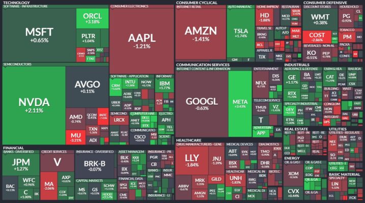 昨日のS&P500のヒートマップを眺めると、上昇と下落の銘柄が半々といったように見えます。