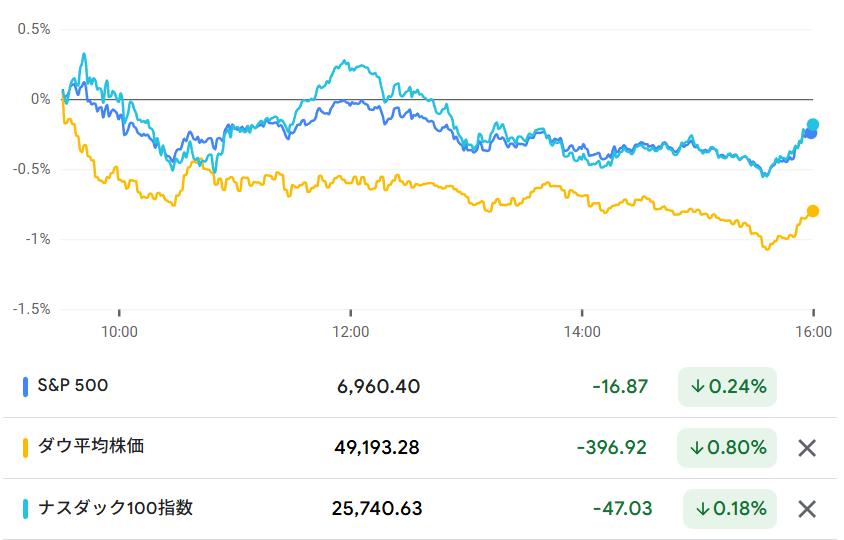 マグニフィセント7は3銘柄が上昇、4銘柄が下落。GOOGLが+1.11%と好調を維持、METAが▲1.70%、AMZNが▲1.57%、MSFTが▲1.36%と大きく下げています。