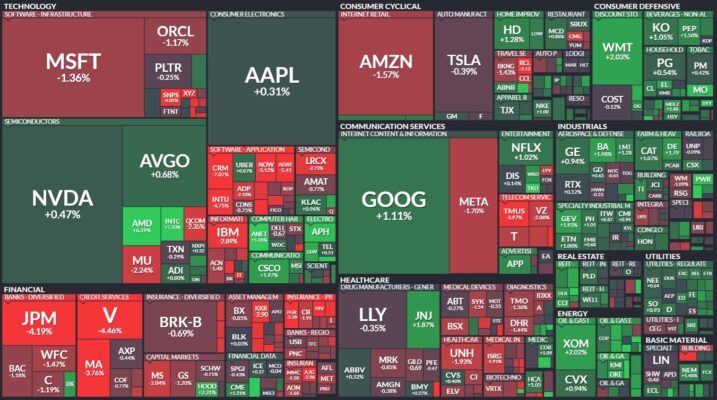 昨日のS&P500のヒートマップを眺めると、上昇と下落の銘柄が混在していることがわかります。