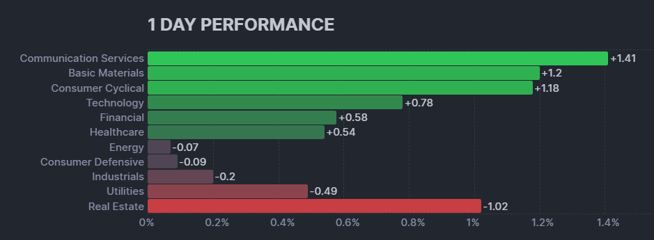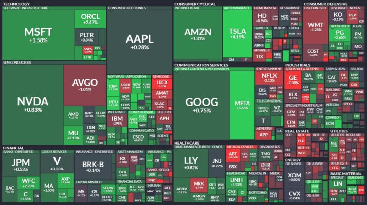 昨日のS&P500のヒートマップを眺めると、上昇した銘柄がおおかったことが分かります。
