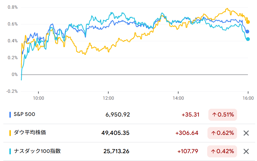 マグニフィセント7は4銘柄が上昇、3銘柄が下落。AAPLが+2.97%、METAが+2.06%、GOOGが+1.57%と大きく上げていますが、TSLAが▲3.09%と大きく下げています。