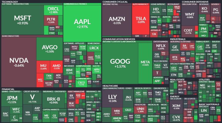 昨日のS&P500のヒートマップを眺めると、多くの銘柄が上昇したことがわかります。