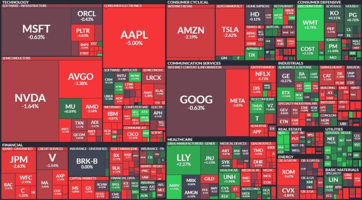 昨日のS&P500のヒートマップを眺めると、多くの銘柄が下落したことがわかります。