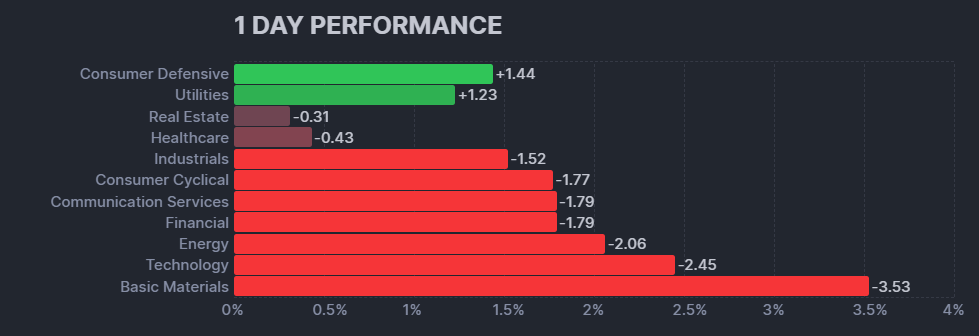 一方で、7セクターが1%以上の下落をしており、素材や情報技術、エネルギーといったセクターは大きく下げています。