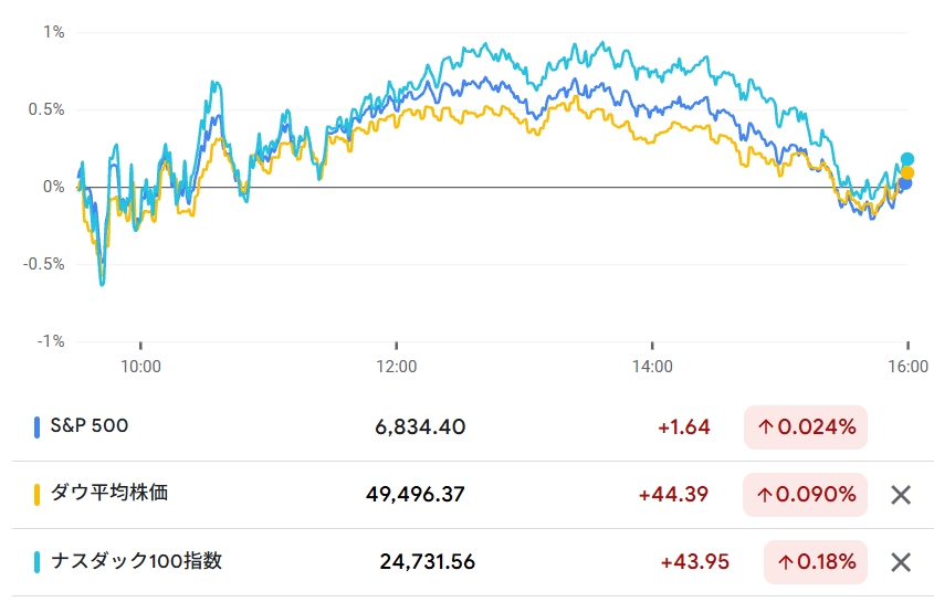 プレマーケットでは値動きのなかった相場は、マーケットがオープンすると一旦下落した後に3指数そろって上昇していきました。