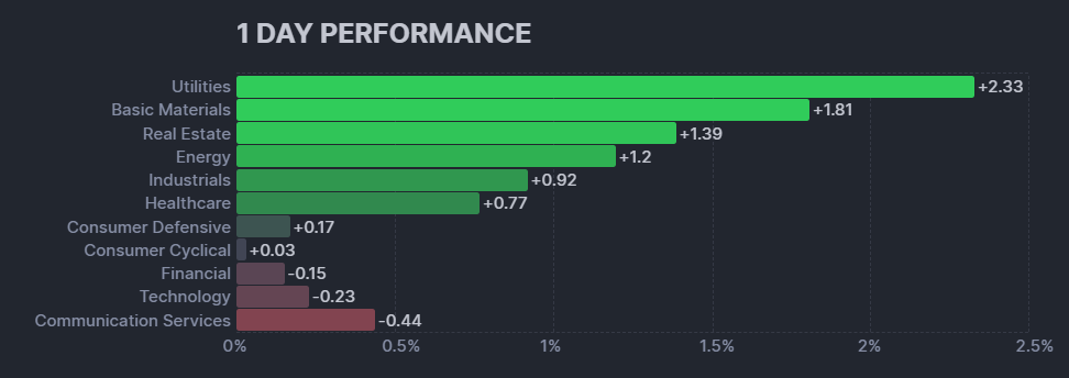 昨日のセクター別パフォーマンスは8セクターが上昇、3セクターが下落した1日となりました。