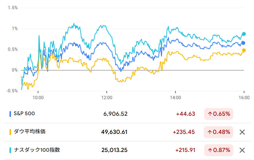 マグニフィセント7は6銘柄が上昇。GOOGが+3.74%、AMZNが+2.56%、METAが+1.69%、AAPLが+1.53%と大きく上げました。