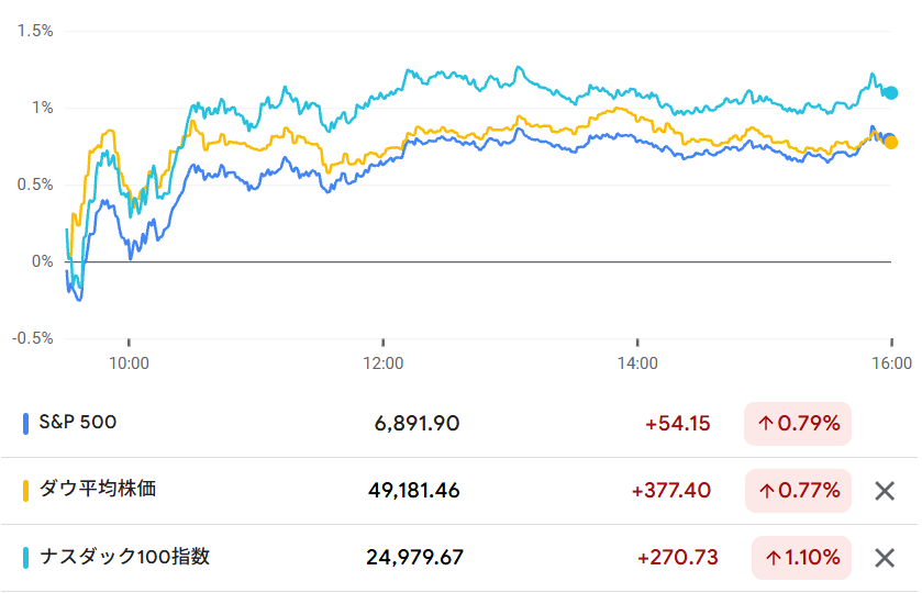 マグニフィセント7は6銘柄が上昇、GOOGのみが下落。TSLAが+2.39%、AAPLが+2.24%、AMZNが+1.60%、MSFTが+1.18%と大きく上げています。